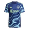 The Ajax Away Shirt 25/26 comes in dark blue and features a yellow-green and light blue water-inspired pattern. The classic crest is embroidered on the chest, next to the adidas logo.